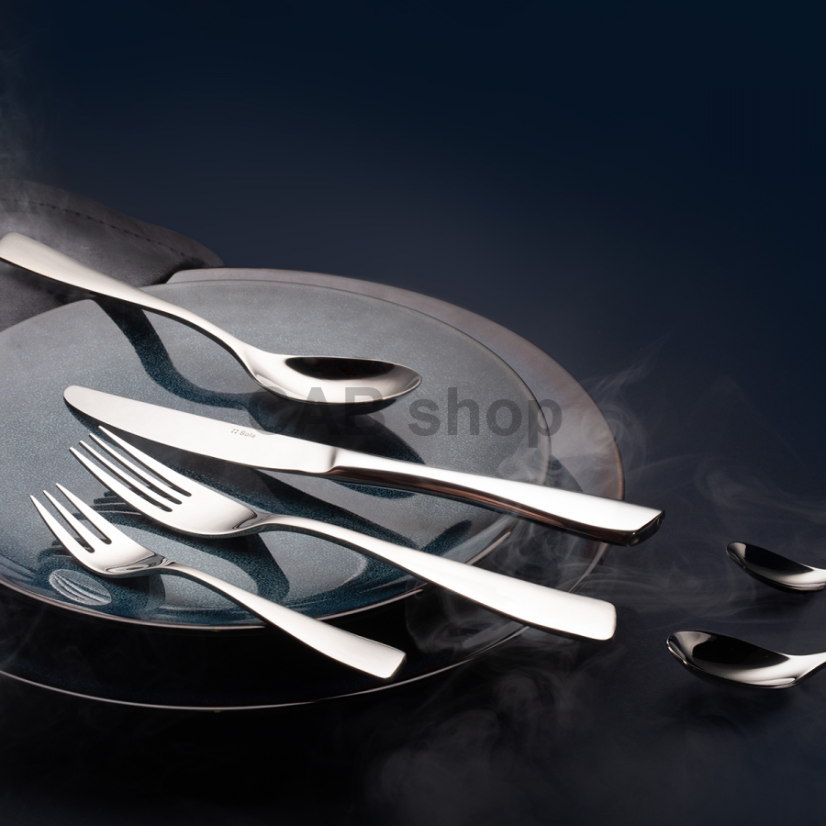 Evőeszközkészlet, amely első pillantásra kitűnik a többi modell közül. A széles, ferde végű fogantyúk stílusos darabká teszik. Dúsítsd hal- vagy steakkéssel, és tálald otthon a teljes Pure kollekcióval. Több